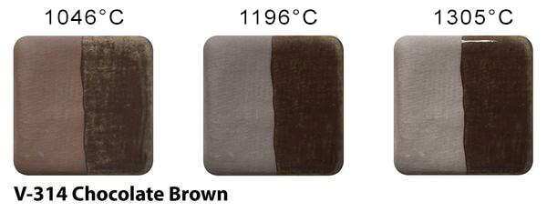 Chocolate Brown ist ein intensives Braun, das um 1050°C am wärmsten wirkt. Die Farbe dunkelt bei 1200°C nach und ist am imntensivsten bei 1300°C, jedoch weniger gesättigt. Diese Unterglasur sieht unter wenigen Schichten einer Transparentglasur großartig aus.