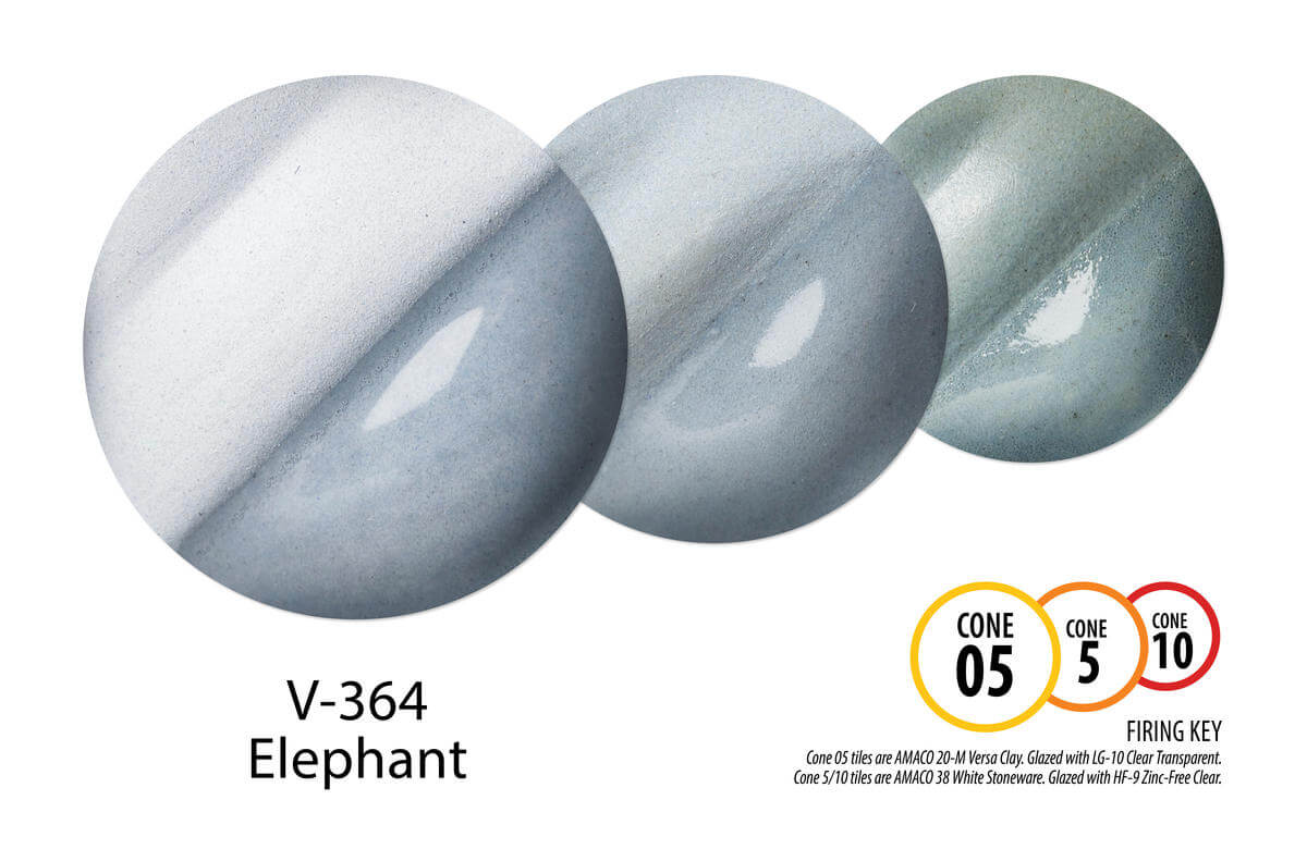 Die Elephant Velvet Unterglasur von Amaco erzeugt einen hellen, aschigen Farbton, wenn sie im Bereich von 1044°C gebrannt wird. Bei 1200°C verdunkelt sich die Glasur zu einem tieferen Grau und verwandelt sich dann in ein Grau-Schwarz, dass der Elefantenhaut ähnelt, wenn es bei 1300°C gebrannt wird. Eine transparente Glasur akzentuiert die Farbe der Unterglasur deutlich bei jeder Temperatur.