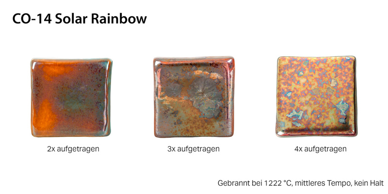 Solar Rainbow entfaltet sein volles Potenzial bei einer Brenntemperatur von 1220 °C, kann jedoch auch sicher bei 1196 °C gebrannt werden.