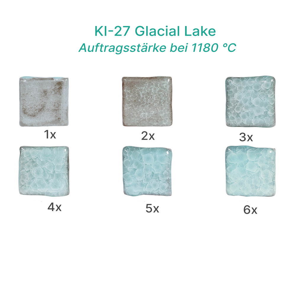 KI-27 Glacial Lake ist ein lebendiger, blaugrüner Glasurton – frisch, klar und mit einer angenehm kühlen Tiefenwirkung. Beim Brand entwickelt sich das typische Eis-Craquelé der Kiln-Ice-Serie: ein feines Netz aus kristallinen Rissen, das die Oberfläche leicht milchig wirken lässt und an gefrorene Seen, Eiskristalle und winterliche Gletscher erinnert.