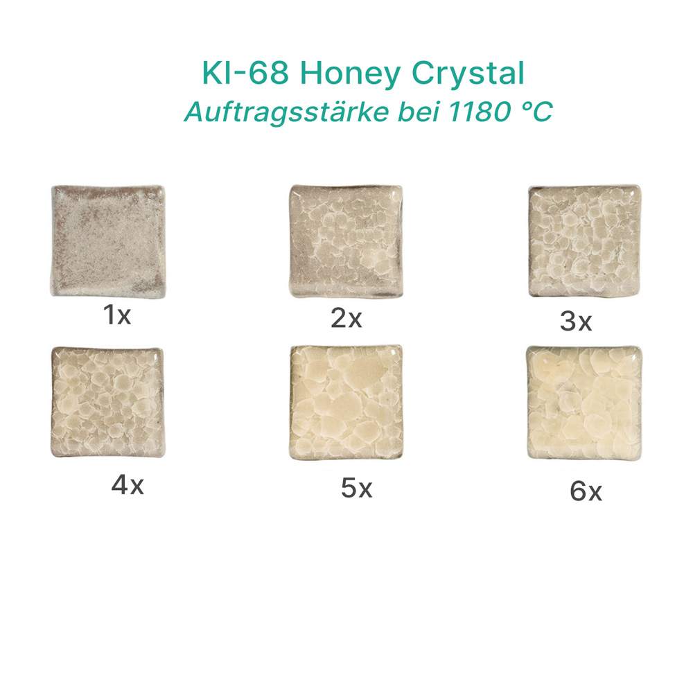 KI-68 Honey Crystal ist ein warmes, goldenes Honiggelb mit einer weichen, leicht buttrigen Ausstrahlung. Durch das charakteristische Eis-Craquelé der Kiln-Ice-Serie entsteht eine spannende, mehrschichtige Optik: Die Glasur bleibt transparent und zeigt dort, wo sich die feinen kristallinen Risse bilden, eine leicht milchige Tiefenwirkung. So entsteht ein lebendiges, natürliches Muster, das an gefrorenen Honig oder kristallisiertes Bernsteinlicht erinnert.