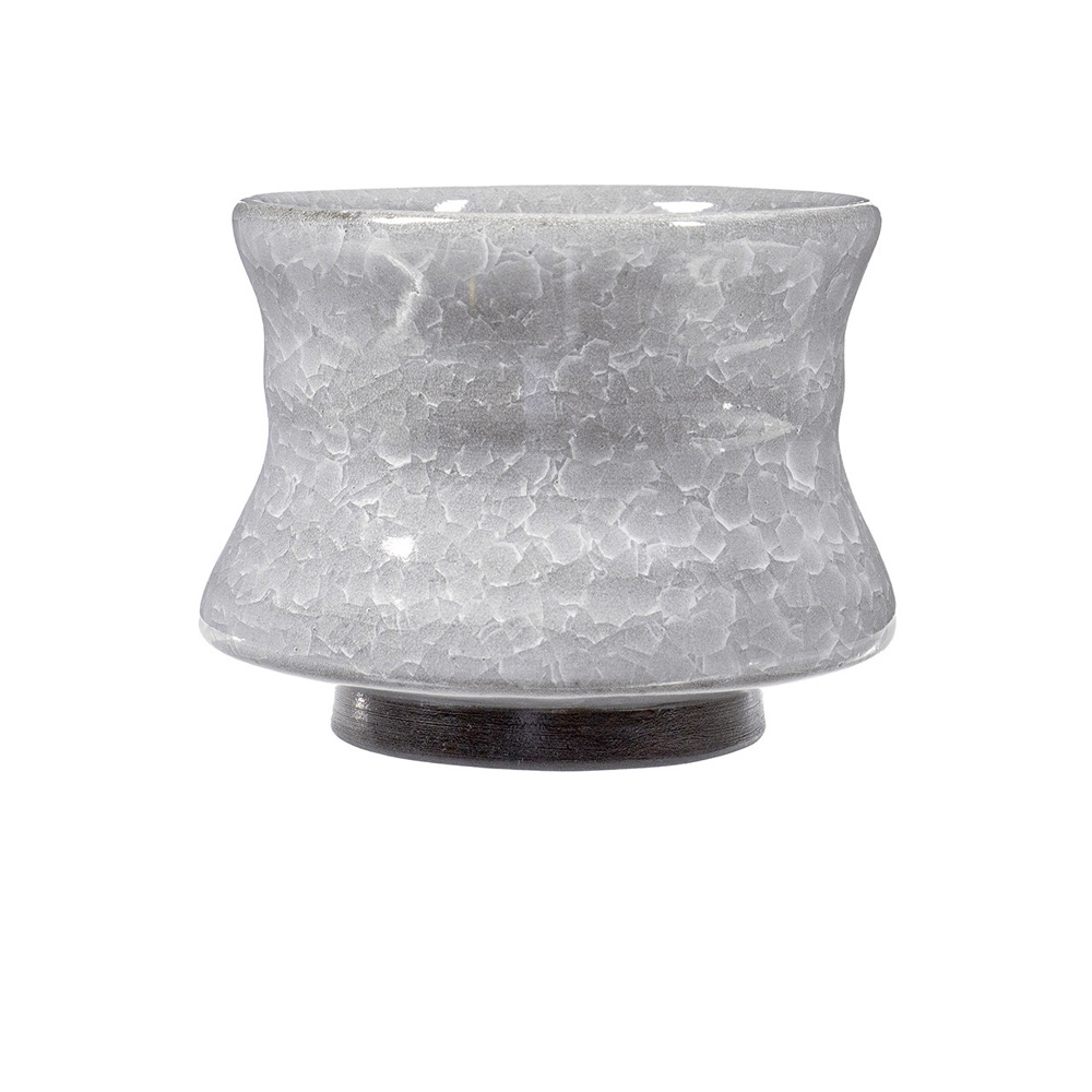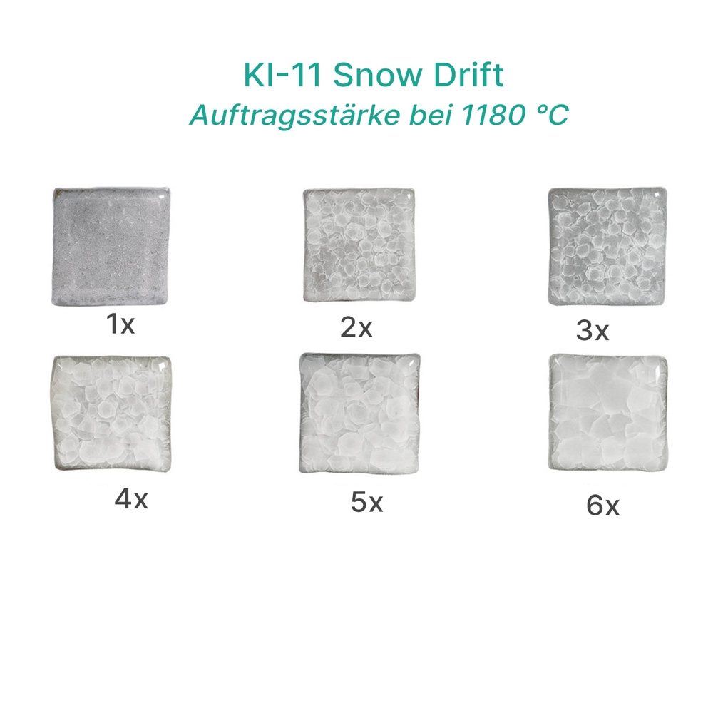 KI-11 Snow Drift ist ein sanftes, milchiges Weiß mit einer weich diffusen Ausstrahlung. Die Glasur bleibt leicht transparent und erzeugt dort, wo sich das Eis-Craquelé bildet, eine zarte, fast schneekristallartige Opazität. Dadurch entsteht eine ruhige, vielschichtige Oberflächenwirkung, die an frisch gefallenen, leicht gefrorenen Schnee erinnert.
