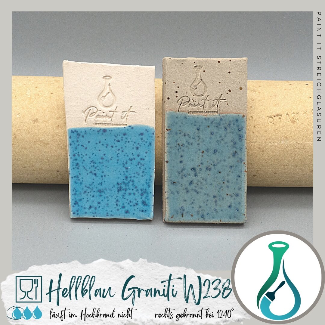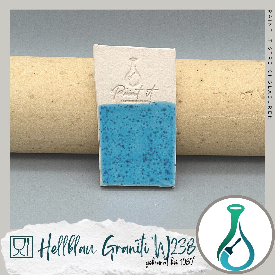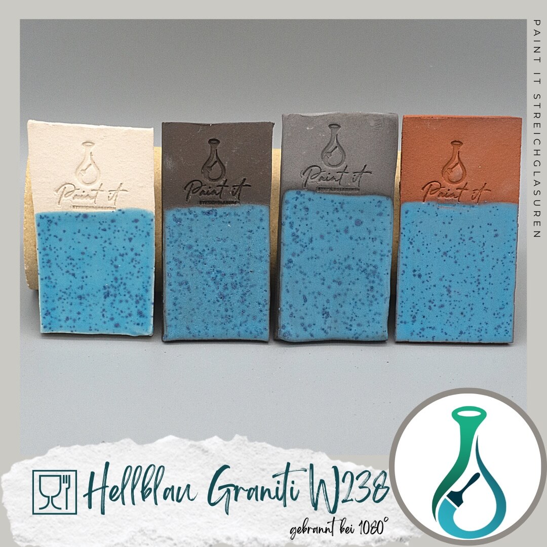 Die Streichglasur Hellblau Graniti aus der beliebten Graniti-Serie zeigt nach dem Glasurbrand ein zart-mattes Hellblau mit dunkelblauen Sprenkeln. Die Glasur behält ihren Farbton auch auf dunkleren Tonsorten.