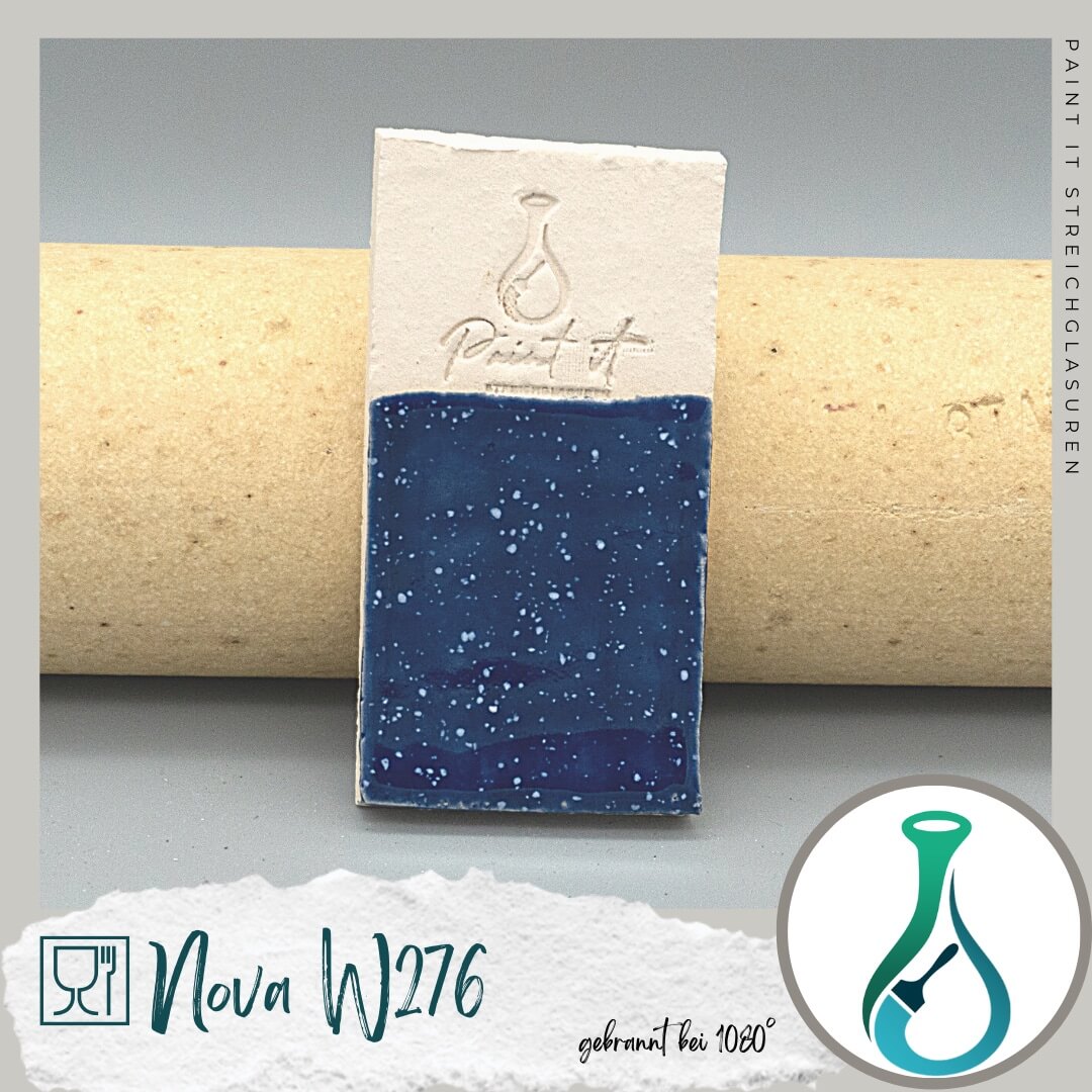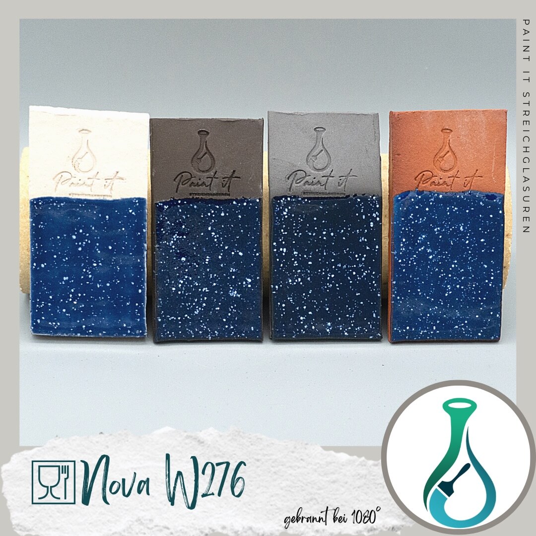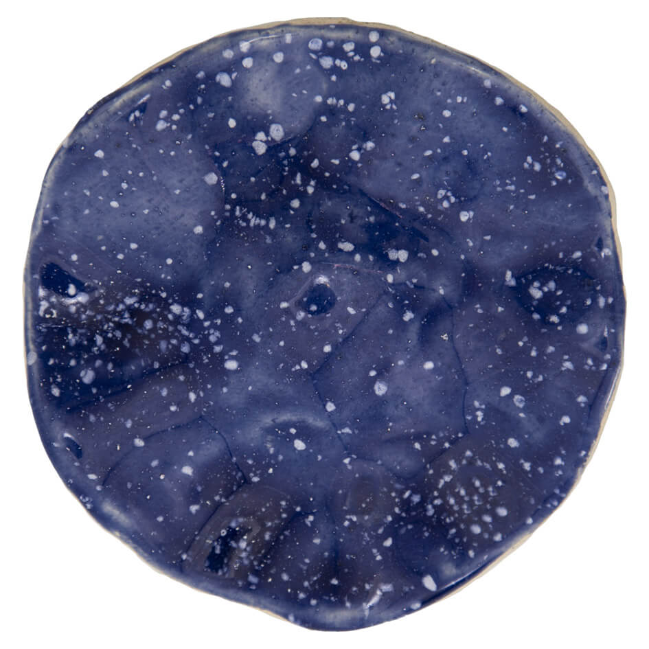 Die Streichglasur Nova ist durch ihren wunderschönen Effekt eine unserer beliebtesten Glasuren. Auf einem dunkelblauen Grundton leuchten weiße Sprenkel und erinnern an glitzernde Sterne in der Tiefe des Weltalls. Der Grundton dunkelt auf rötlichem und schwarzem Ton ab ohne dass die Effekte ihr kräftiges Weiß verlieren.