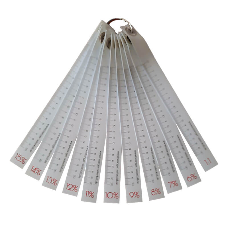 In dem Set Schrumpflineale (bestehend aus 10 Linealen von 6%-15% Tonschrumpfung) ist auch 1 Lineal 1:1 dabei. Sie werden von einem zu öffnenden Metallring zusammengehalten und sind aus wasserfestem Kunststoff.