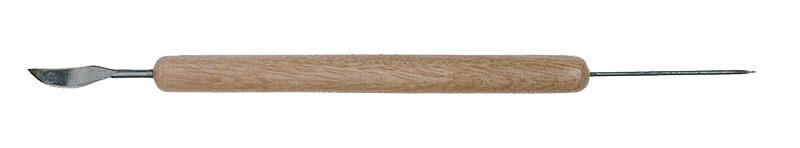 Die Töpfernadel besteht aus einem angenehmen Holzgriff sowie auf der einen Seite der Nadel aus Edelstahl, auf der anderen Seite einem Kratzwerkzeug.