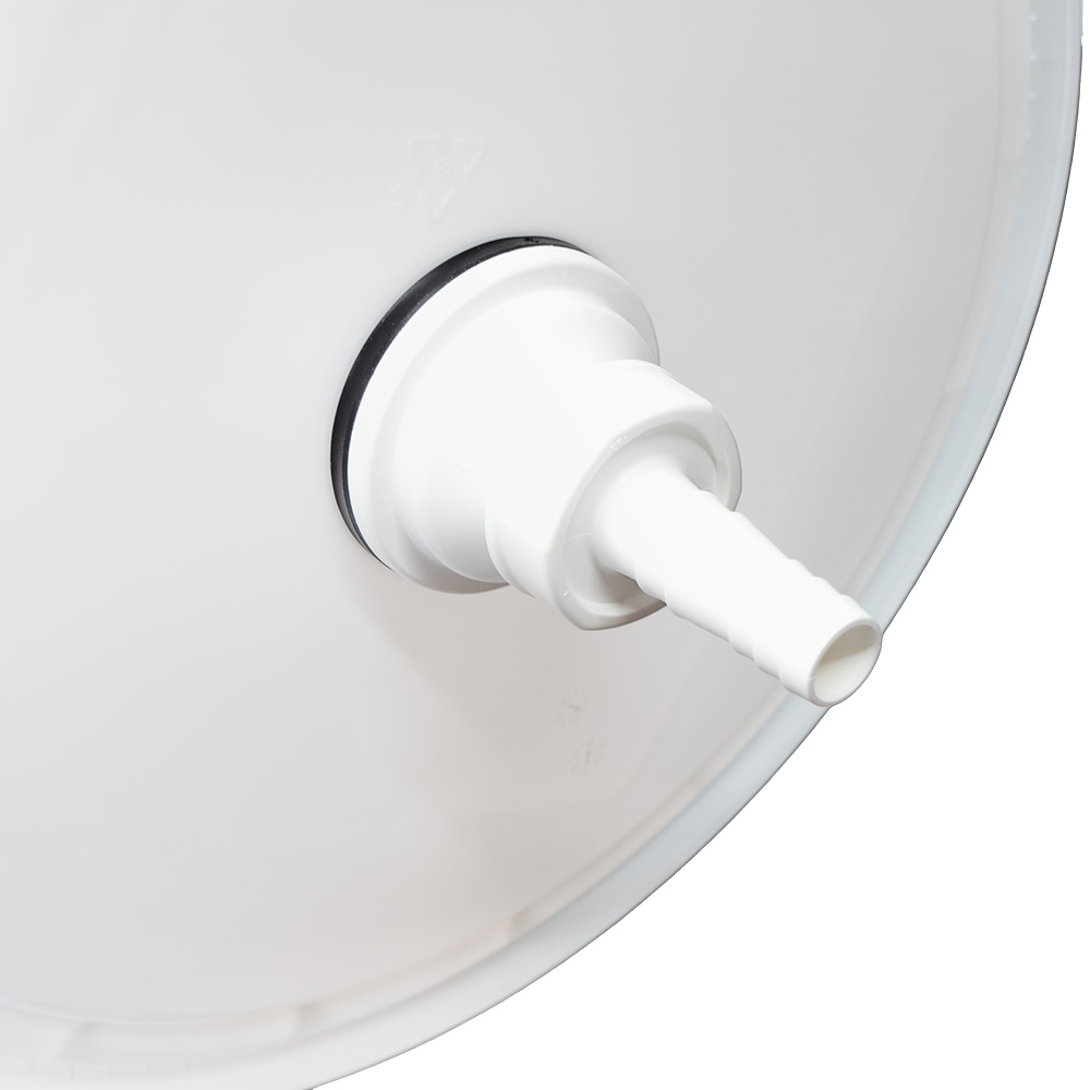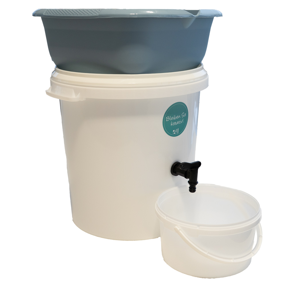 Nach der Reinigung fließt das Wasser durch den Ablauf in den 10 Liter Inneneimer. Hier setzen sich die festen Überreste ab, während das größtenteils gereinigte Wasser in den 32 Liter großen Behälter weitergeleitet wird. Dank des integrierten Ablasshahns lässt sich das Wasser anschließend bequem in einen 3 Liter Auffangeimer ablassen.